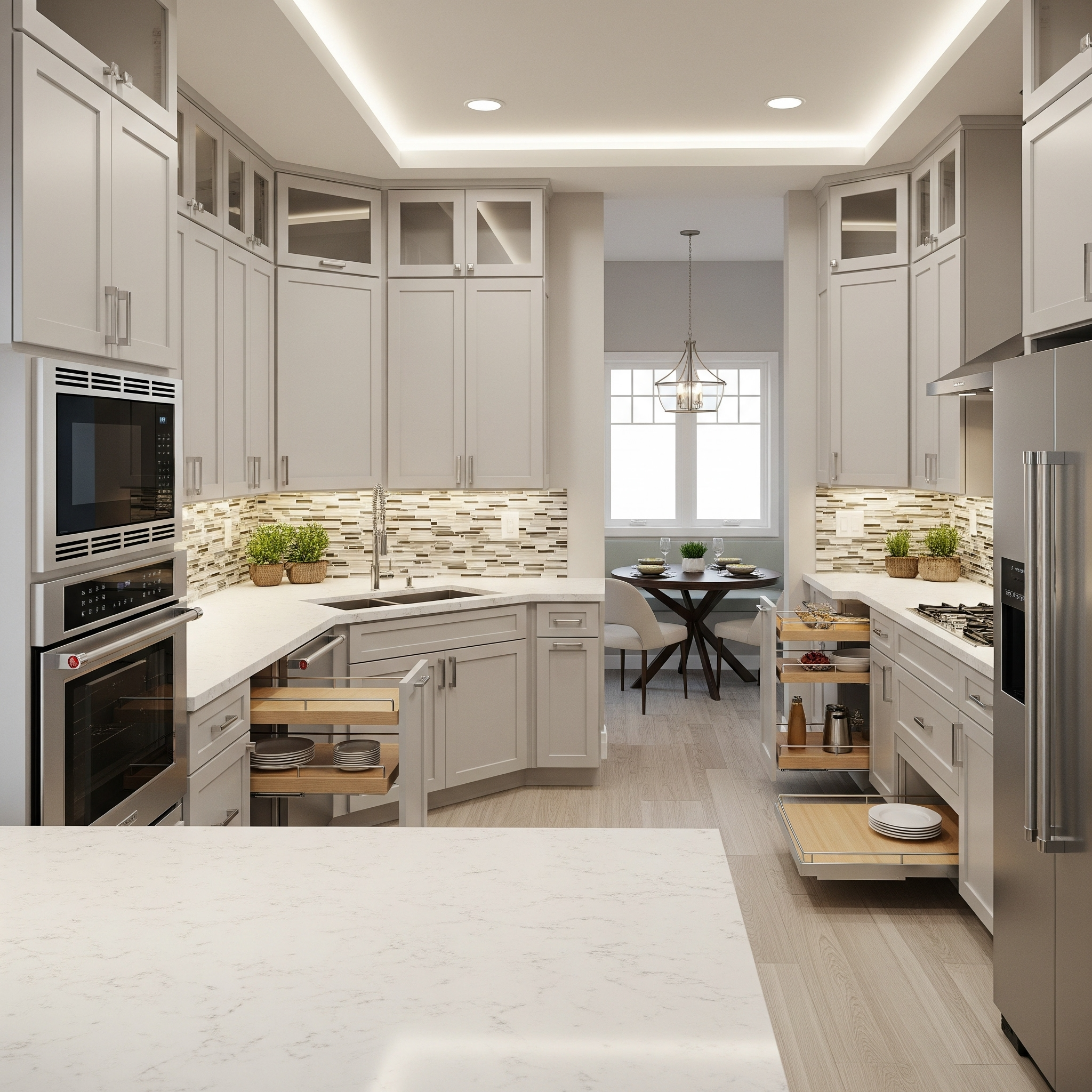 L-shaped kitchen layouts succeed when designers tackle the corner cabinet challenge, making the most of the l shape layout. Functional designs incorporate lazy Susans, pull-out corner drawers, or diagonal corner sinks that turn dead space into accessible storage. Corner cabinets are a key storage solution in these layouts. Planning the corner treatment during design phases is key.