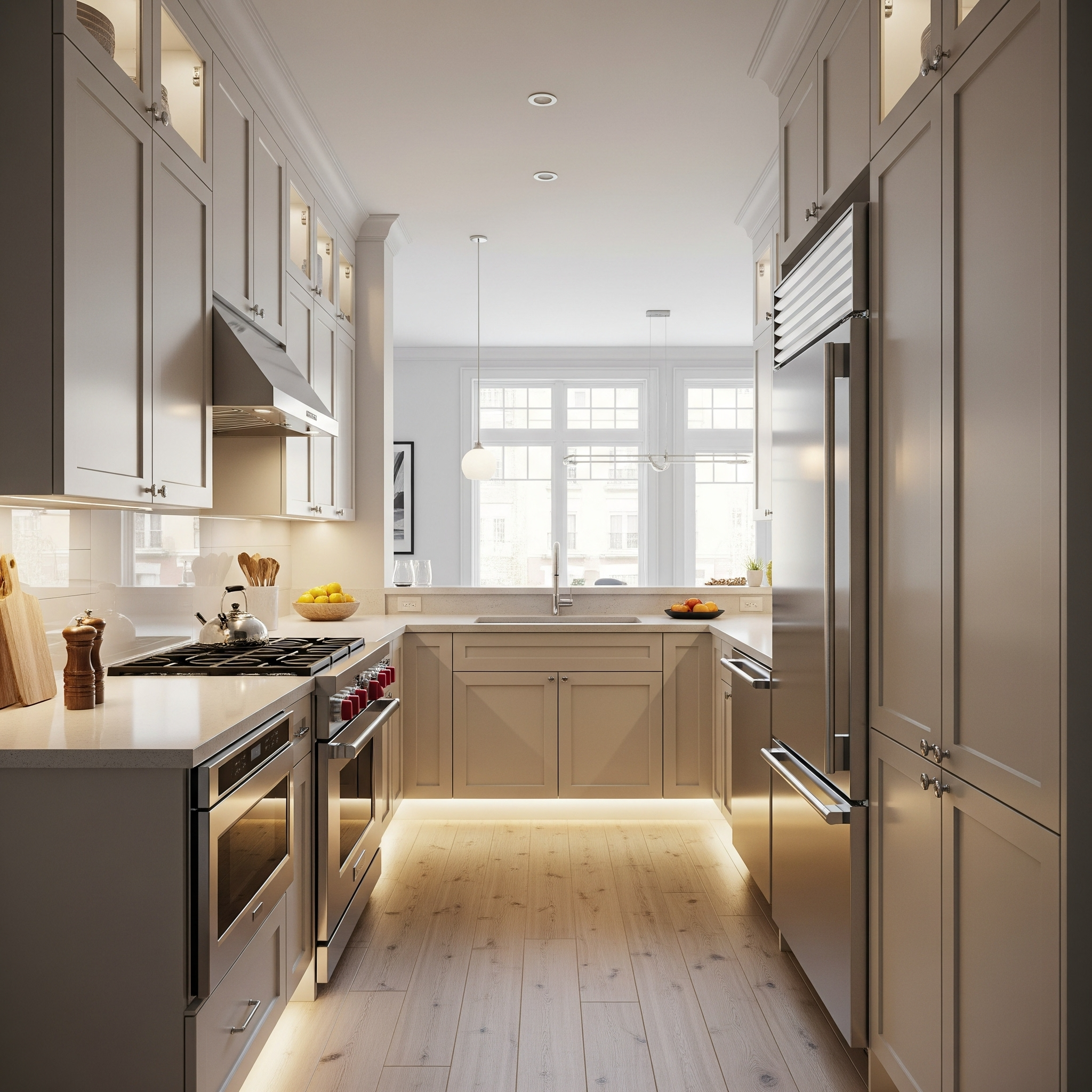 Modern galley kitchens have shed their cramped reputation through strategic design. The key is creating visual continuity while maximizing every square inch. A galley kitchen layout features two parallel walls, which create a compact and efficient workspace. Successful galley renovations feature light-colored cabinets extending to the ceiling, under-cabinet lighting to eliminate shadows, and sight lines that draw the eye through the space rather than emphasize boundaries.